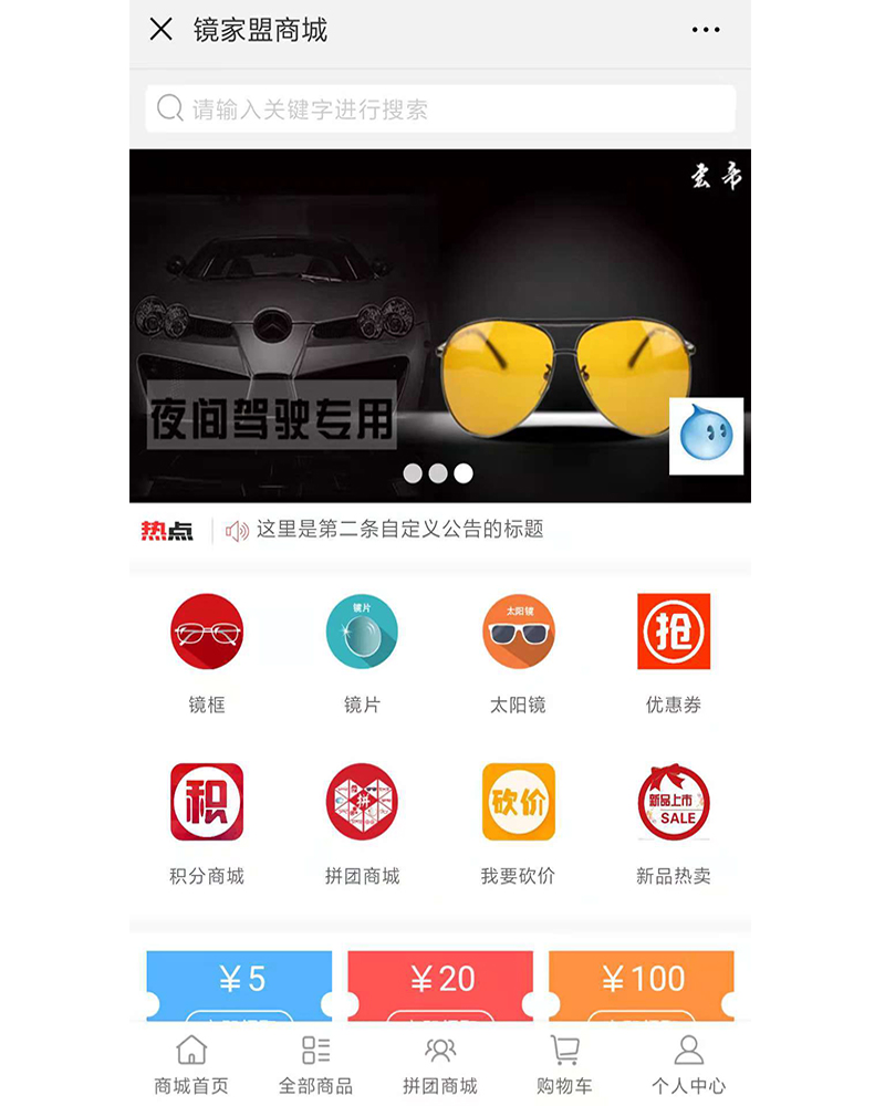 該應(yīng)用是專為眼鏡愛好者的購物公眾號,設(shè)計(jì)開發(fā)積分商城、拼團(tuán)、砍價等功能模塊。